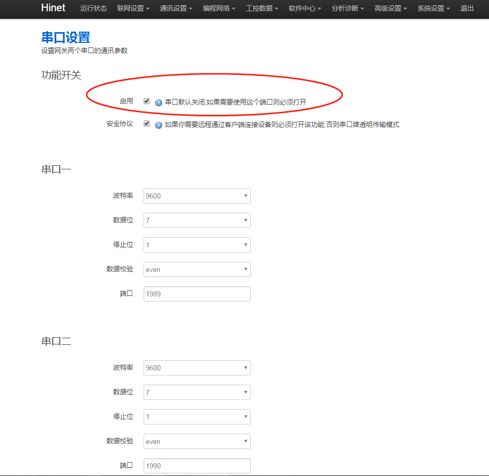 1. 网关串口功能是否开启,进网关后台,点击“通讯设置 - 串口设置”,串口勾选【启用】。